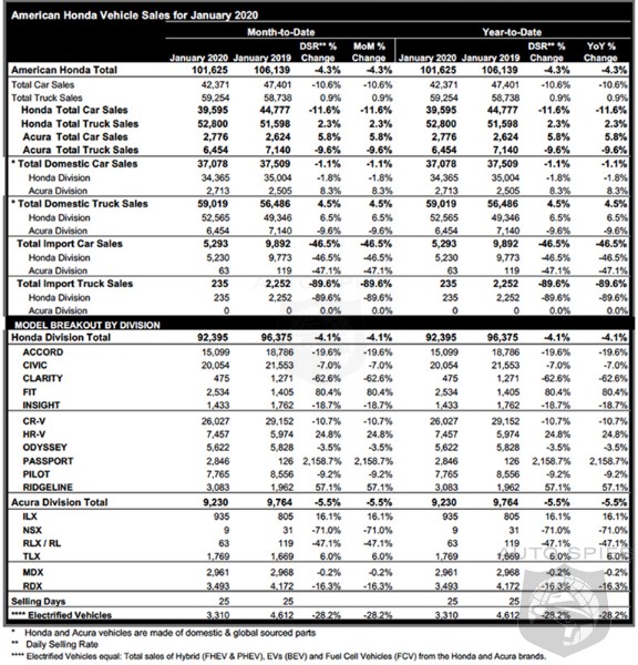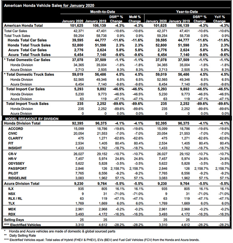 Honda trucks captured a new January sales record as HR-V also set a new mark and Ridgeline deliveries jumped almost 60%. While the industry continues its dramatic shift toward light trucks, Honda entered 2020 by maintaining its retail market share gains with passenger cars, led by Civic with sales of 20,054 units.