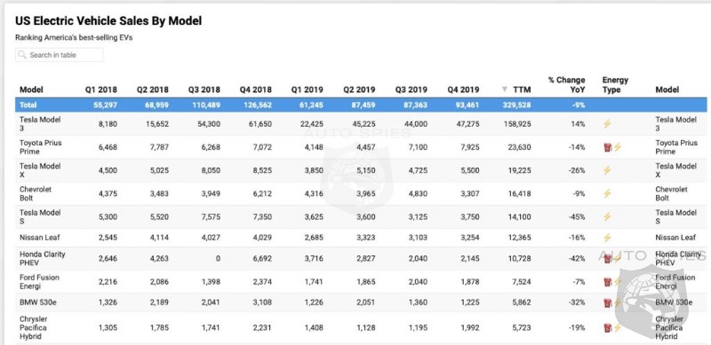 The list of the Top 10 electric and hybrid vehicles in the United States in Q4 2019 was packed with some of the most notable names in sustainable transportation. However, only one of the vehicles on the list reported a positive year-over-year change in sales: The Tesla Model 3.