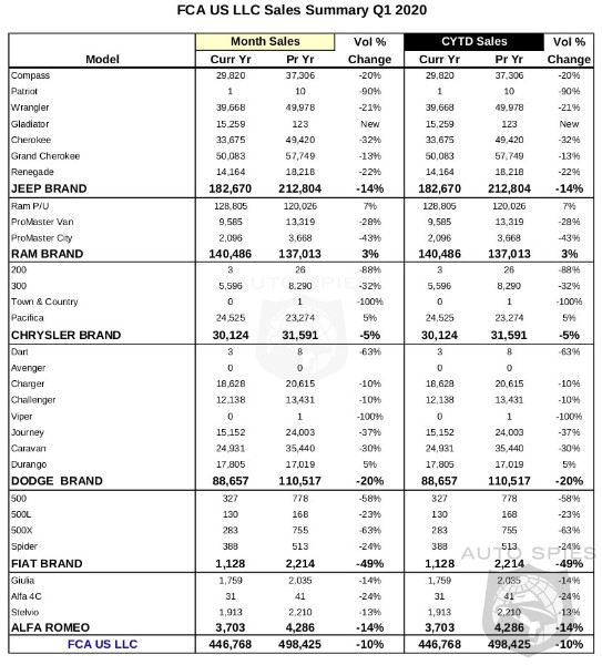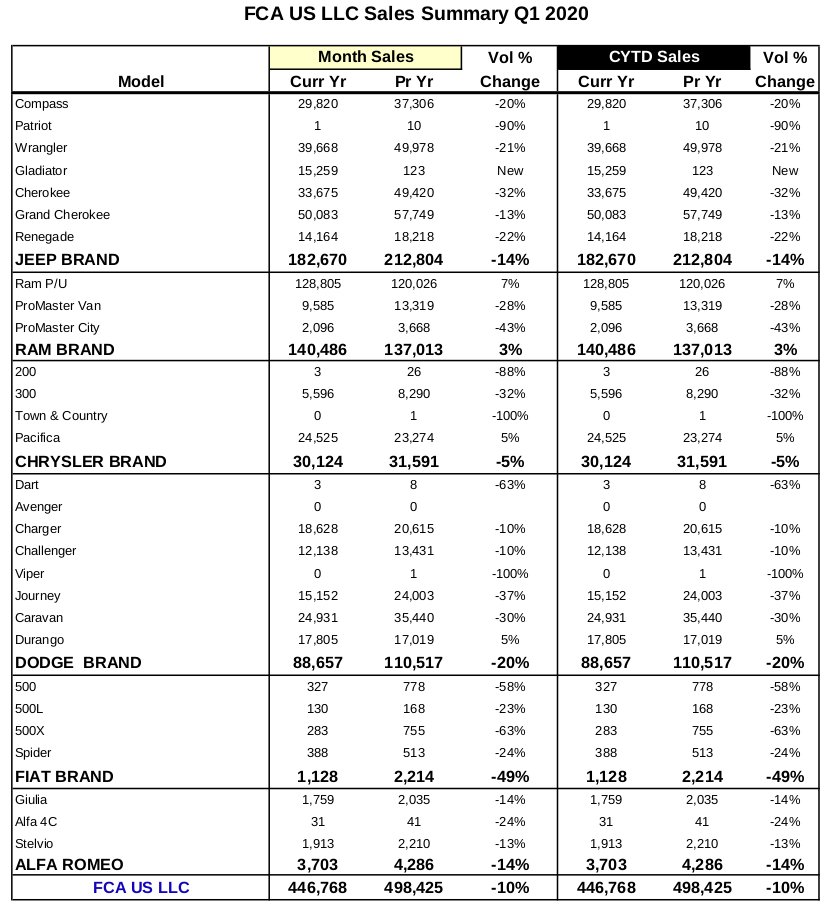 FCA US LLC reported a 10 percent decline in its first-quarter sales as the strong momentum in January and February was more than offset by the negative economic impact of the coronavirus in March.