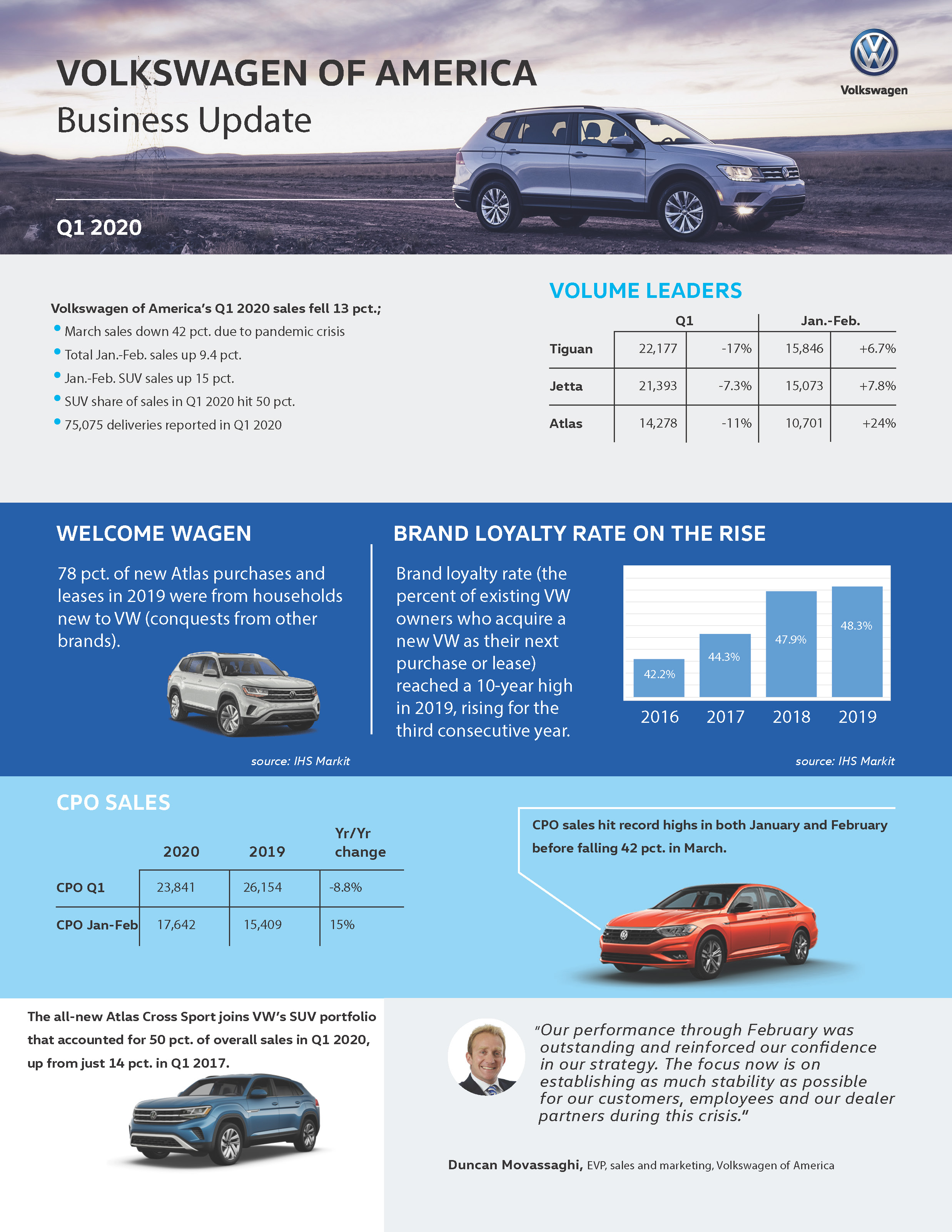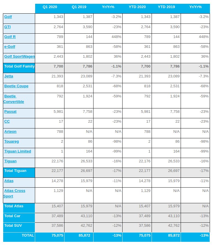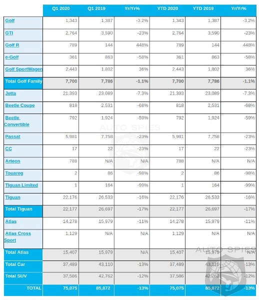 Volkswagen today announced their first quarter sales results with a sales drop of 13% mainly due to the coronavirus quarantine in March.