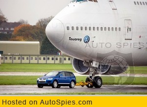 A Volkswagen Touareg V10 TDI has succeeded in towing a Boeing 747-200 weighing approximately 155 tonnes. Watched by engineers, Volkswagen personnel and bemused passers-by, the Touareg V10 TDI completed seven complete runs on the auxiliary runway at Dunsfold Aerodrome, 40 miles south west of London.