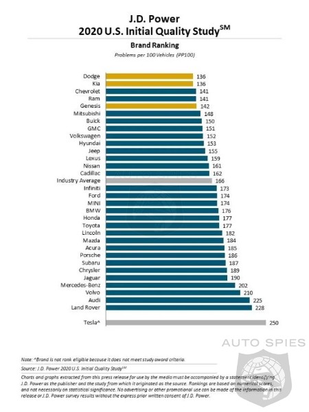 Dodge and Kia tie for highest in overall initial quality, each with a score of 136 PP100. Dodge is the first domestic brand in the study’s history to rank highest. This is the sixth consecutive year that Kia is the highest-ranked mass market brand. Chevrolet and Ram place third in a tie (each with 141 PP100). Genesis is the highest ranked premium brand for the fourth consecutive year in the study.