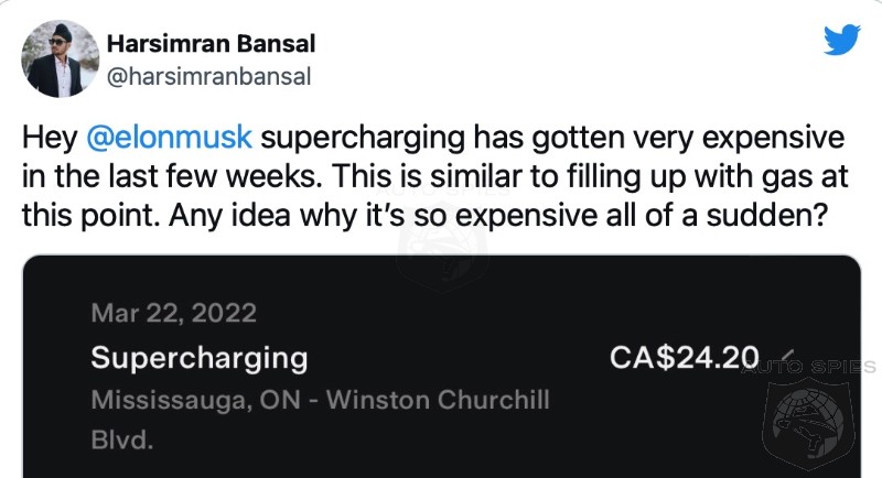 Hey @elonmusk supercharging has gotten very expensive in the last few weeks. This is similar to filling up with gas at this point. Any idea why it’s so expensive all of a sudden? pic.twitter.com/lcNaMvDJnW— Harsimran Bansal (@harsimranbansal) March 29, 2022