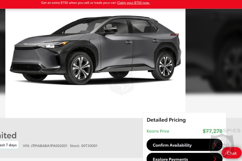Objectively, the Toyota bZ4X is a fine car. It's Toyota's first real EV effort, so we've got to give the brand some slack there. It does have some charging issues, in addition to a somewhat disappointing range (252 miles isn't much compared to the Mach E). But, it's supposed to be a competitively-priced entry to EV ownership for those familiar with the Toyota brand.Toyota of Portland and Koons Toyota don't see it that way. Both dealers want used Porsche money for a mid-level electric crossover. Koons is by far the worst of the two and is selling a bZ4X at an eye-watering $77,278. We understand a small markup. A quick search reveals these models are still trickling out of the factory, with few available right now. But these markups are downright ridiculous.