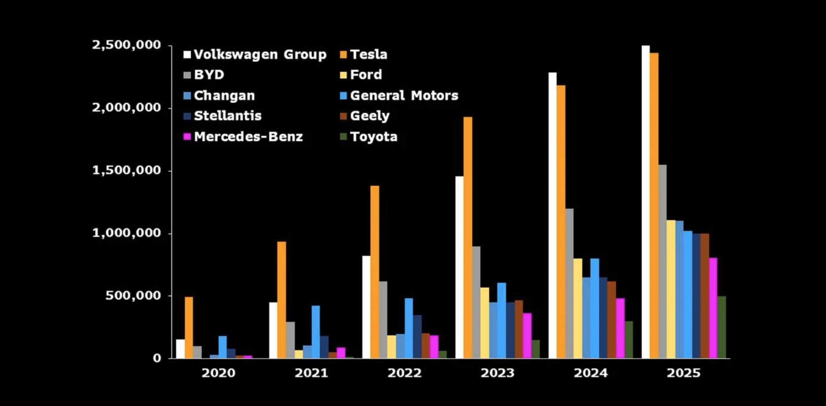 According to a comprehensive report published this morning by research firm Bloomberg Intelligence, Tesla will hold its global crown for EV sales for the next 18 months but will then be usurped by Volkswagen electric vehicles. The full BEV outlook report predicts that many legacy automakers will lag in sales through 2025, but Volkswagen is on track to overtake Tesla’s production volume by 2024.