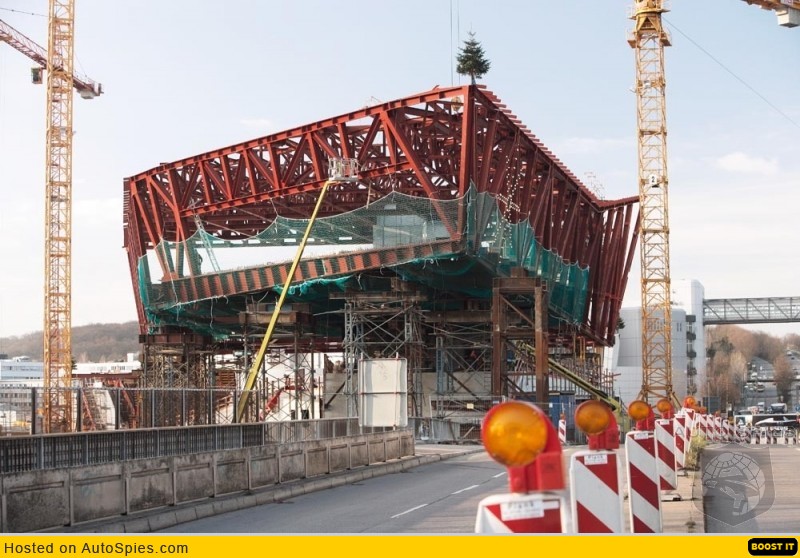 450 days after the ground-breaking ceremony, the shell of Dr. Ing. h. c. F. Porsche AG’s new museum in Stuttgart Zuffenhausen is largely completed as 2006 draws to a close. An important construction phase is thus concluded: the underground car park, ground floor, first floor and central girders, the “cores”, made from reinforced concrete have been constructed. At total of 21,000 cubic meters of concrete have been used. The around 100 employees – partly thanks to the mild weather of recent weeks – have made rapid progress, even during the cold season. Many night shifts were arranged to lift major parts of the construction into place by crane, and on several occasions Schwieberdinger Strasse (B 27) was closed on one side during at night when there was little traffic on the roads.