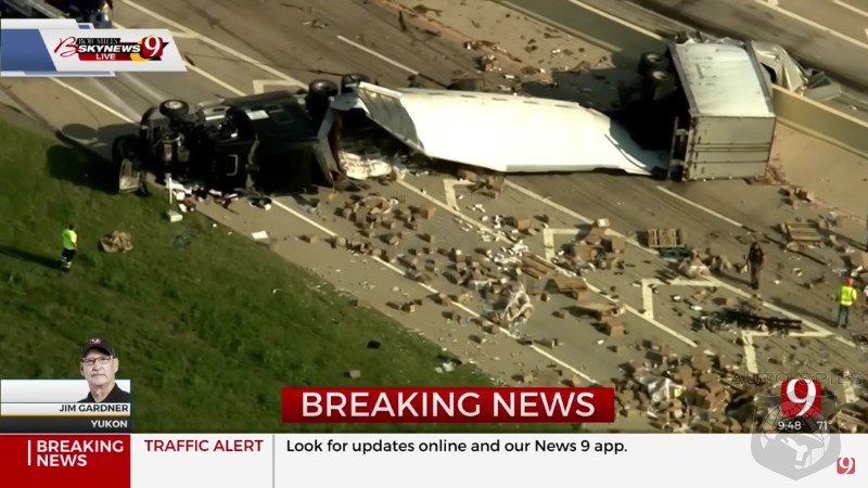 The situation became literally quite slippery on Wednesday morning when a semi-tractor trailer collided with a box truck on I-40 near Mustang on the western fringes of the Oklahoma City metro. The rollover crash caused the semi cargo to spread across the Interstate, with tons of what appeared to be sex toys and lubricant covering the road surface. As you’d expect, new reporters were quick at the scene, and listening to their description of the cargo was hilarious.