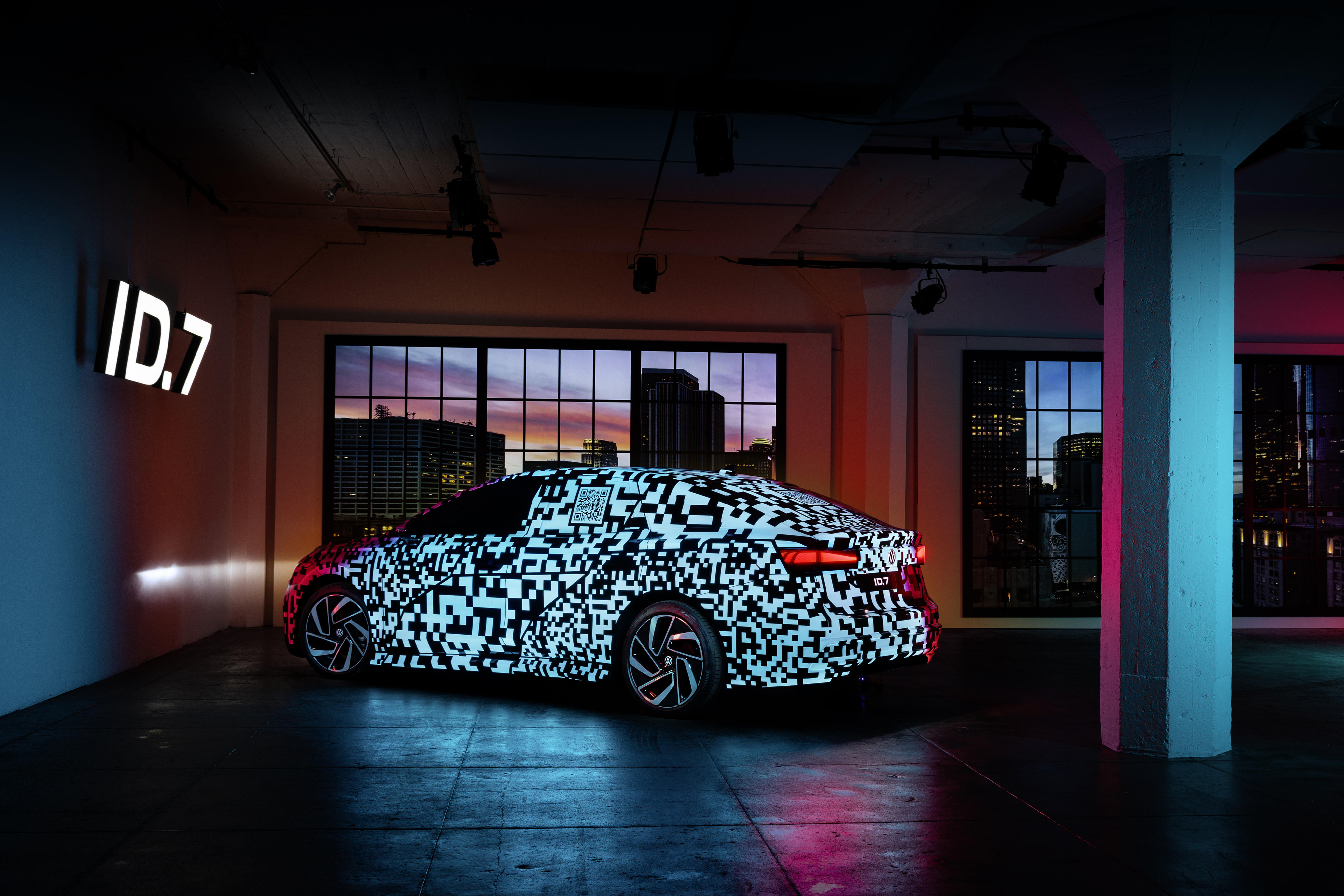 At the CES in Las Vegas, VW will show the ID.7 in a special way. The camouflaged sedan features a digital design with unique paintwork, which lights up the ID.7 interactively. No fewer than 40 layers of paint have been applied, some of which are conductive while others have insulating properties. A total of 22 areas of the vehicle can be controlled separately and are electrified below the top layer of paint (electroluminescence) so that they light up. If all this is connected to a sound system, the rhythm is visualized by illumination of individual areas.