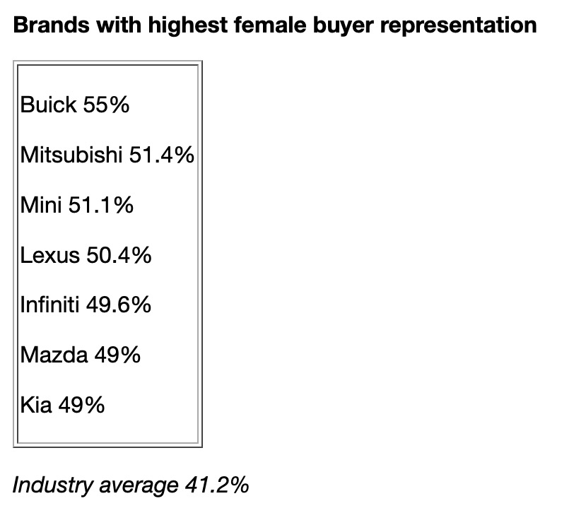 On the other hand, the gender gap was the largest for Ram, with a 37.3 percentage point difference between male and female buyers. The survey highlights the increasing importance of women in the car buying market. Women currently make up around 45% of all car buyers, and their influence is expected to grow in the coming years. As such, car brands are paying more attention to women's preferences and needs in their product development and marketing strategies. Car brands that are more successful in appealing to women buyers may see increased sales and customer loyalty.