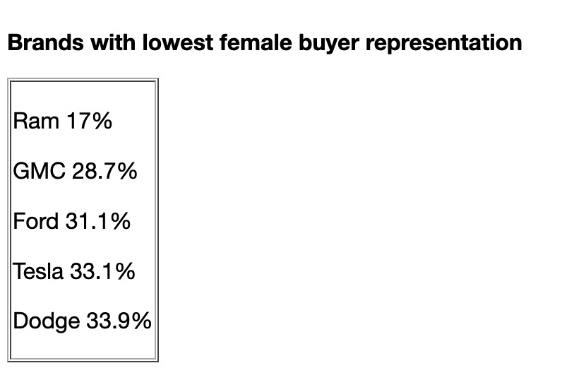 The survey found that Tesla was the most popular car brand among women, with 31.7% of its buyers being women. Following Tesla were Subaru (31.5%), Kia (29.5%), Honda (28.5%), and Mazda (28.2%). On the other hand, the brands with the lowest percentage of women buyers were Ram (14.7%), GMC (17.7%), Chevrolet (18.1%), Ford (19.1%), and Jeep (19.9%).