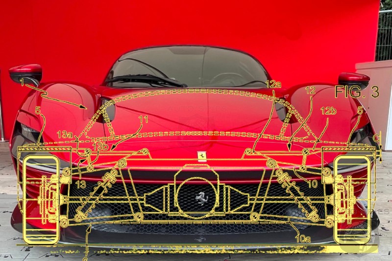 Ferrari is working on fenders that are rigidly mounted to the wheel uprights, but it doesn't know quite how to make the idea work. CarBuzz discovered Ferrari's latest patent filed with the European Patent Office. Modena wants the fender to move along with the wheel because its current fenders, which are rigidly mounted to the body, are less than ideal in the Italian engineers' eyes. We've seen spy images of the LaFerrari replacement, which does not appear to have this system in place.