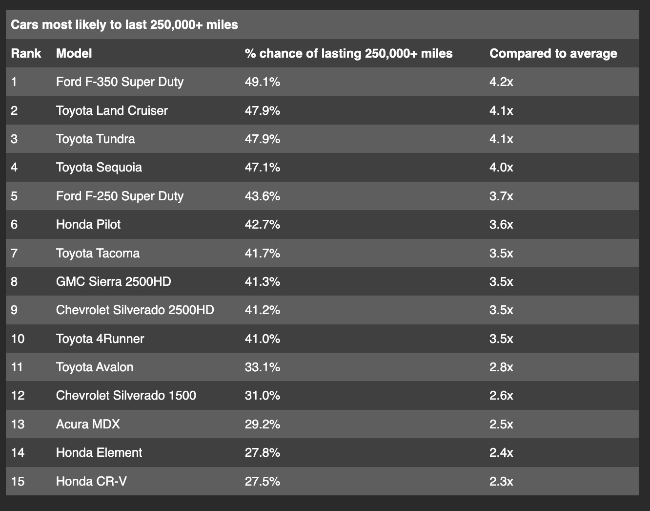 The average vehicle has only an 11.8 percent chance of lasting 250,000 miles, but the latest iSeeCars.com study identified the 23 longest-lasting models most likely to reach a quarter million miles or more.