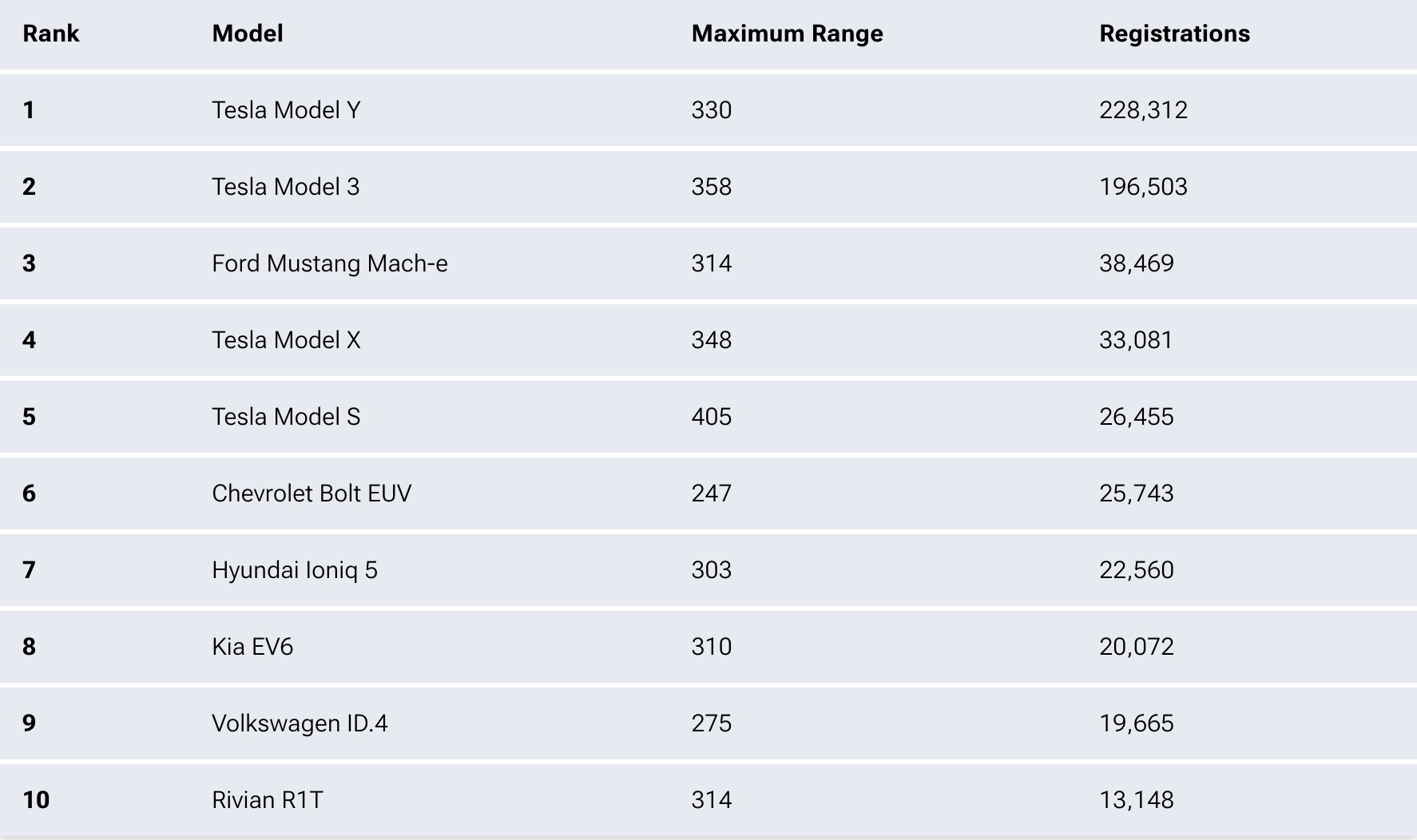 Whereas automakers used to point to their huge horsepower figures, the rise of the electric vehicle has created a new figure for them to boast about. Registration numbers for 2022 show that Americans love an EV with more than 300 miles of range.