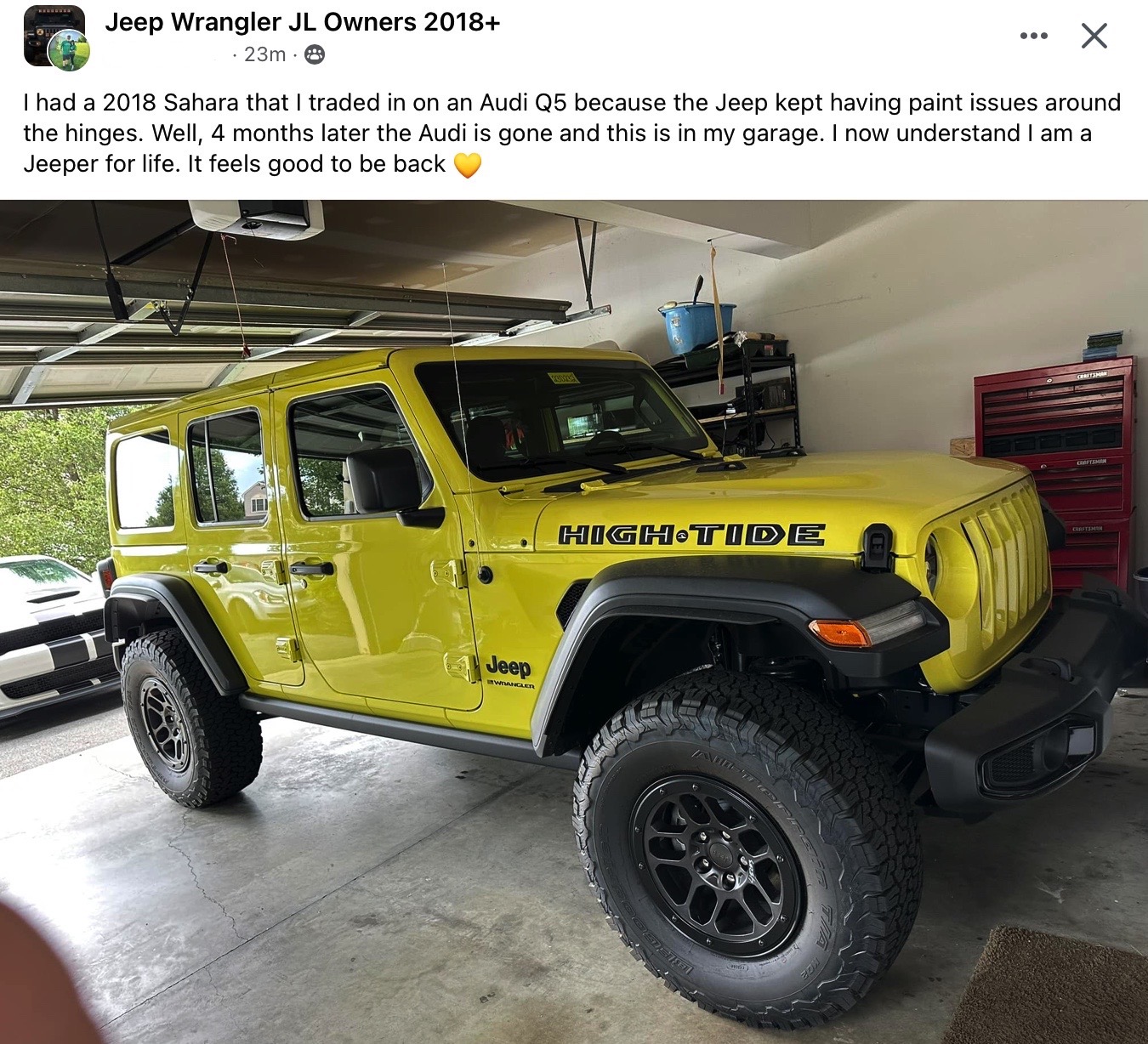I had a 2018 Sahara that I traded in on an Audi Q5 because the Jeep kept having paint issues around the hinges. Well, 4 months later the Audi is gone and this is in my garage. I now understand I am a Jeeper for life. It feels good to be back
