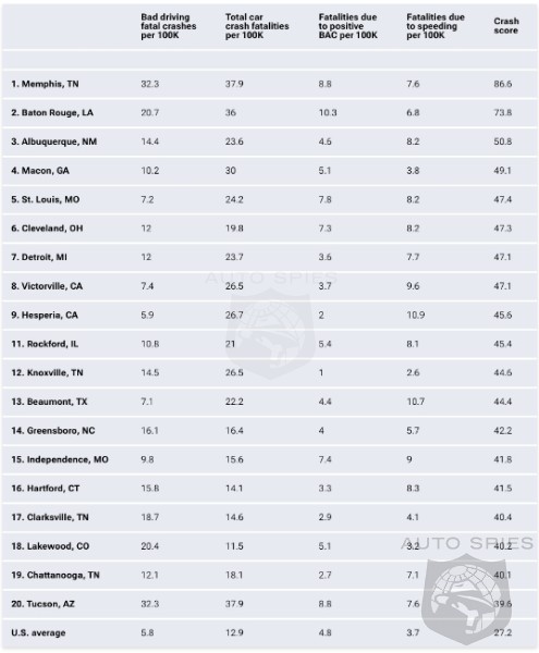 With 32.3 fatal crashes per 100,000 residents, Memphis is the city with the most collisions caused by bad driving in America. Based on data from the U.S. Department of Transportation, the city experienced a total of 238 fatal accidents in 2021 (the most recent year for which records are available).