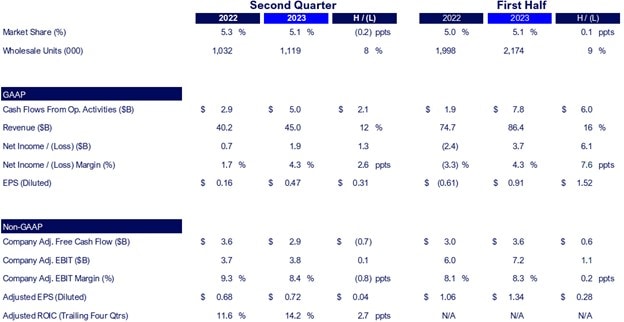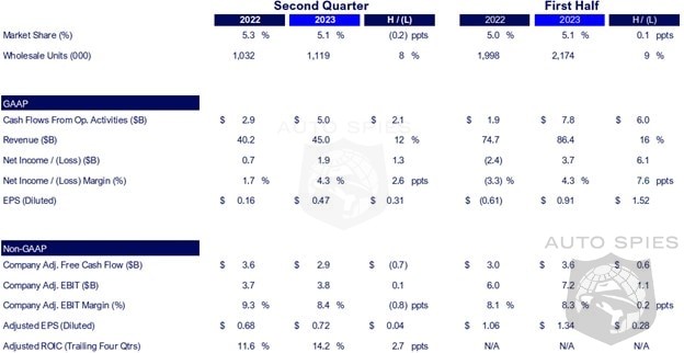 Ford was again America’s top-selling brand in the quarter – net sales increased more than 11% – and for the first six months of 2023. Worldwide, demand for Ford’s fresh lineup of trucks, SUVs and commercial vans pushed second-quarter revenue up 12%, to $45 billion. Quarterly net income was $1.9 billion, nearly three times higher than in the year-ago period and a 4% margin. Adjusted earnings before interest and taxes, or EBIT, grew to $3.8 billion or 8.4% of revenue.