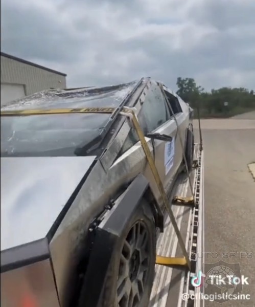 A crashed Tesla Cybertruck prototype was spotted on a car hauler after being subjected to a ditch rollover test, presumably on its way back to a Tesla facility, according to a now-deleted TikTok video that was archived and re-posted on the Cybertruck Owners Club forum by the user Old Spice (embedded at the top of this page).