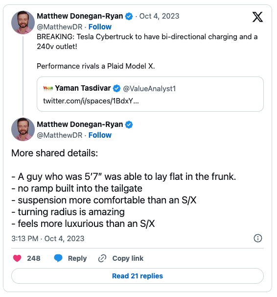 As Tesla Cybertruck deliveries are imminent, the internet is flooded with pictures, videos, and speculations about the electric pickup truck. There's so much noise these days that it's hard to follow the Cybertruck's real story. Obviously, there are people closer to Tesla who know more than they can tell. In a recent Spaces call on X, a Tesla insider revealed many exciting details about the upcoming pickup truck after he reportedly test-drove it on Tuesday.