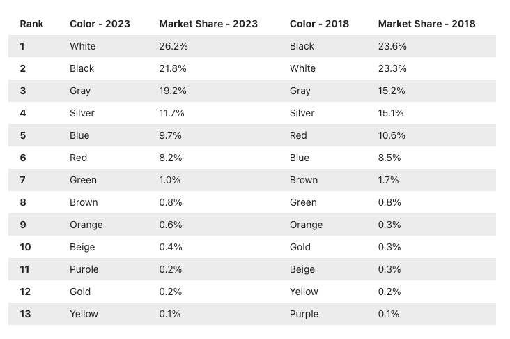 If you're sitting near a parking lot right now, I invite you to look around and take in the colors. Something tells me that you're sitting in a sea of monochrome: black, gray, silver, and white (which isn't actually a color). Am I right?
