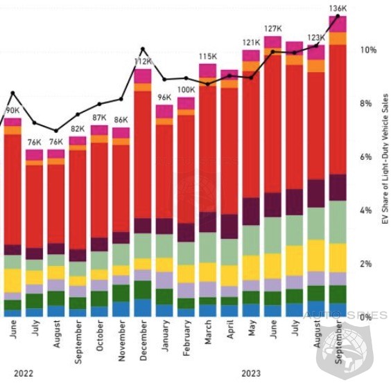 The sales charts show that automakers delivered 136,000 new EVs in September, up 67 percent from a year earlier. Sales were driven by Tesla, which handed over nearly 59,000 vehicles to customers. In all, battery powered vehicles accounted up more than 11 percent of the nation’s automotive market share.