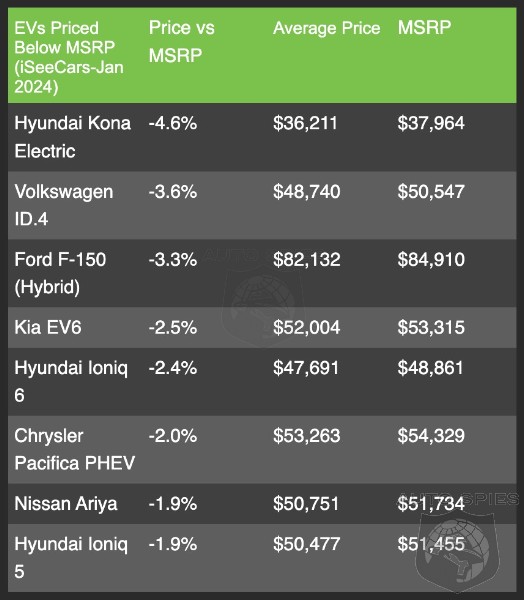 Models like the Hyundai Ioniq 5 and the Kia EV6—both of which fared exceptionally in InsideEVs reviews—are going for 1.9% and 2.5% lower than their MSRPs on average. The Hyundai Kona Electric has the steepest discounts. At an average price of $36,211, it’s priced 4.6% lower than the MSRP. The Volkswagen ID.4. is sailing in the same boat. At an average price of $48,740, it costs 3.6% below MSRP. However, note that these prices might vary regionally.