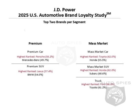 The U.S. Automotive Brand Loyalty Study, now in its seventh year, uses data from the Power Information Network® (PIN) to calculate whether an owner purchased the same brand after trading in an existing vehicle on a new vehicle. Customer loyalty is based on the percentage of vehicle owners who choose the same brand when trading in or purchasing their next vehicle. Only sales at new-vehicle franchise dealers qualify. The study includes brand loyalty across five segments: premium car; premium SUV; mass market car; mass market SUV; and truck.