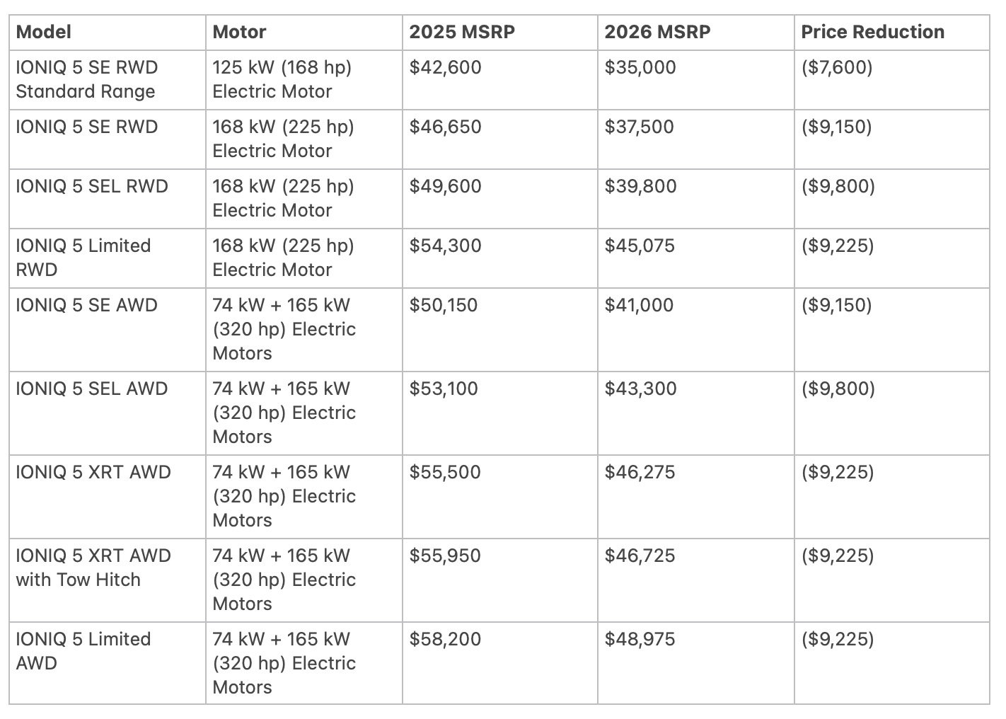 Below is a comparison of the 2025 and 2026 IONIQ 5 pricing (excluding $1,600 freight charges for 2026 models):