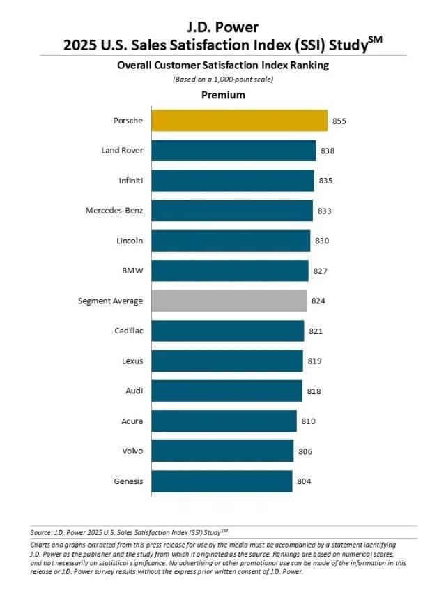 Porsche ranks highest in sales satisfaction among premium brands for a third consecutive year, with a score of 855. Land Rover (838) ranks second and Infiniti (835) ranks third.