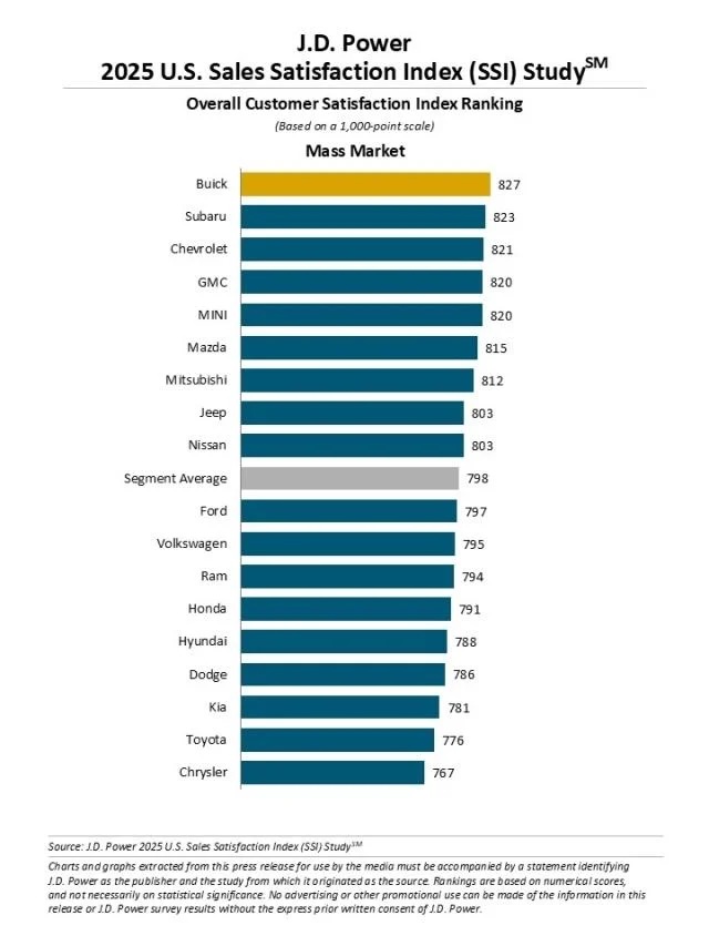 Buick ranks highest in sales satisfaction among mass market brands with a score of 827. Subaru (823) ranks second and Chevrolet (821) ranks third.