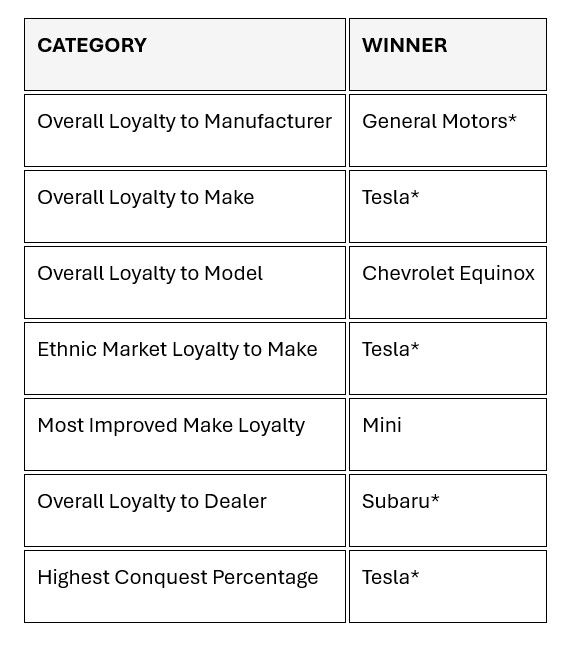 General Motors received the ‘Overall Loyalty to Manufacturer’ award for the 11th year in a row. Tesla was the recipient of the ‘Overall Loyalty to Make’ award for the fourth consecutive year.