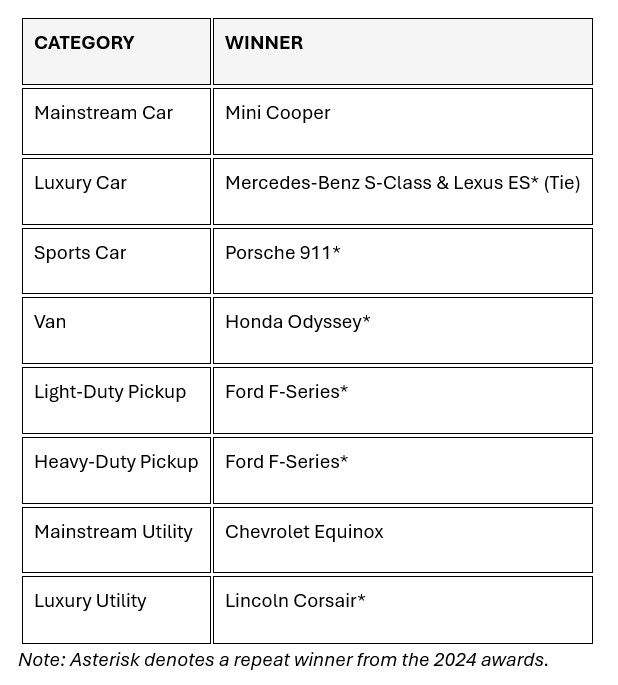 The 2025 awards are based on an analysis of 13.6 million new retail vehicle registrations in the U.S. from October 2024 through September 2025.