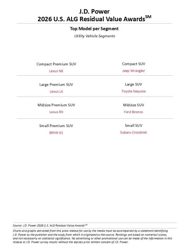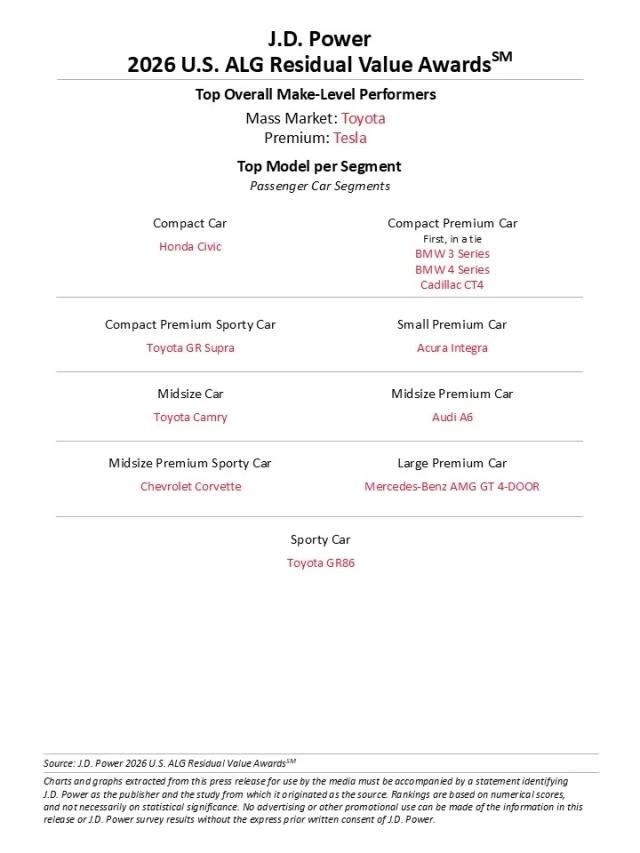 In a market where affordability pressures are pushing more customers to weigh the total cost of vehicle ownership, the estimated worth of a vehicle at the end of its lease term, known as a residual value, is a key indicator of long-term resale value and affordability. The J.D. Power 2026 U.S. ALG Residual Value Awards,SM released today, highlight the importance of residual values, with Tesla and Toyota showcasing the strongest results.