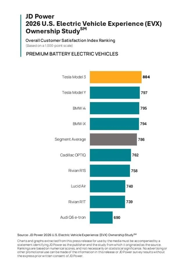 There are nine award-eligible models in the premium segment and nine award-eligible models in the mass market segment. Satisfaction among owners of premium BEVs averages 786, up from 756 last year, while satisfaction among owners of mass market BEVs averages 727, versus 725 in 2025.