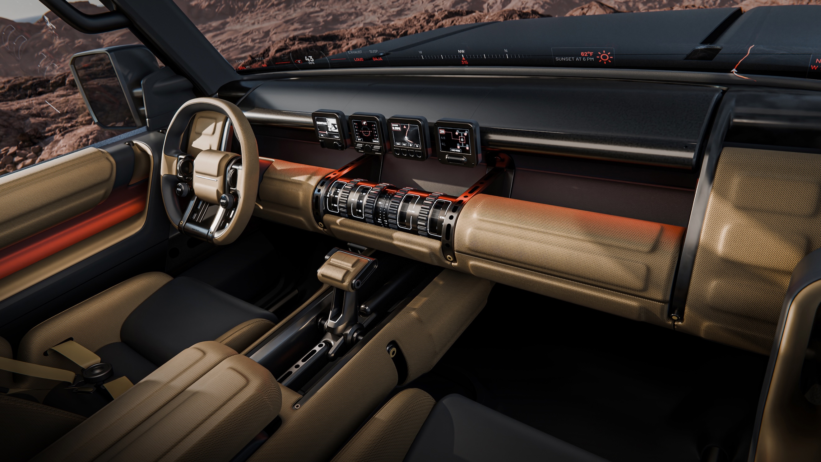 The Boulder Concept’s interior utilizes robust materials for key touchpoints including grab bars and other high-wear areas. Frequent-use switchgear includes satisfying physical knobs and buttons within easy reach for confidence-inspiring use, even when bouncing over uneven terrain.