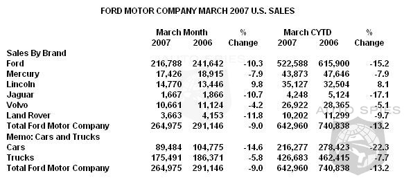 Ford's F-Series pickup truck posted March sales of 71,481 – the highest monthly sales since August 2006. Compared with March 2006, which was F-Series' highest sales month of 2006, sales were down 15 percent. The company expects F-Series' comparisons to improve as availability of the all-new 2008 model Super Duty increases.