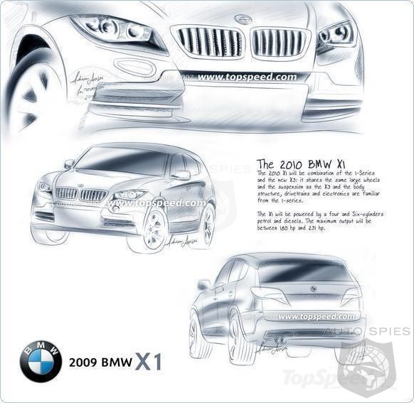 The large wheels and the suspension come from the X3. The underbody, the drive train, and the electronics will be taken from the 1-series. The X1 will be principally a four-seated, but since the rear chairs slidThe X-drive 4WD system will be lifted directly from the X3 SUV with drive trains and electronics coming from the 1-series. It will be powered by a range of engines from the 1 Series including four cylinder and six cylinder gas engines ranging from 145 to 220 hp. The X1 will also come with diesel engines.