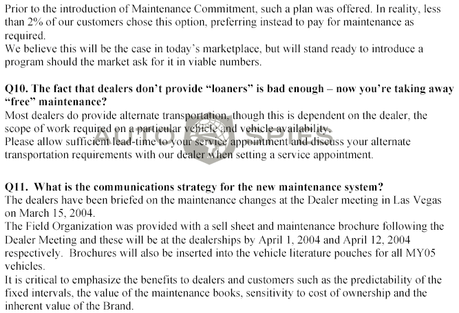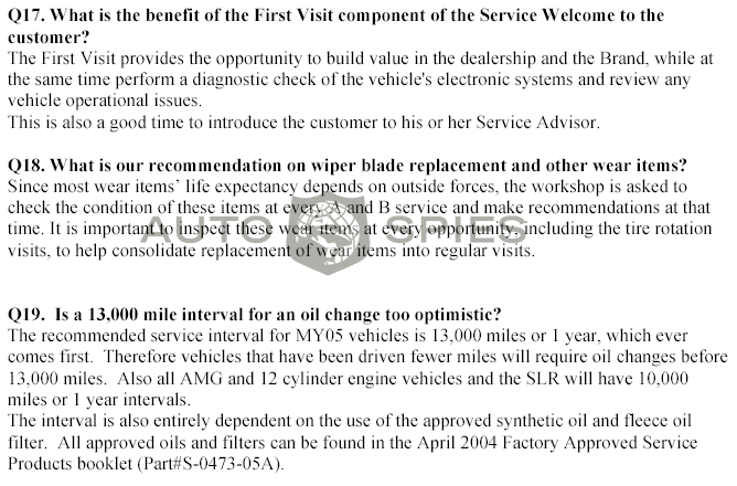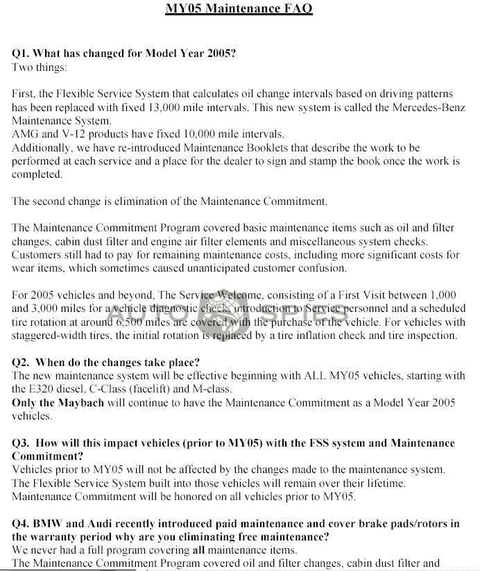 As you know, we broke the story a few weeks ago about MB dropping free maintenance in 2005 models.We even got you the brochure to prove it.This week, we have the next installment...The official Q&A from MB that will be sent to dealers in order for them to be able to clearly communicate the message to MB owners...