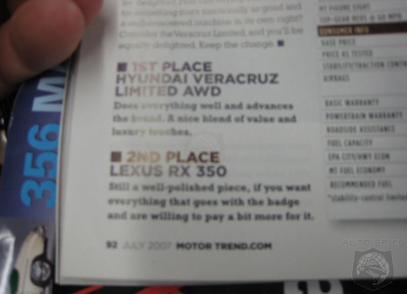 When I picked up the new issue of Motor Trend last week and I was paging through it, when I came across a comparo between the Lexus RX350 and Hyundai Veracruz SUV's (or are they crossovers now ;).