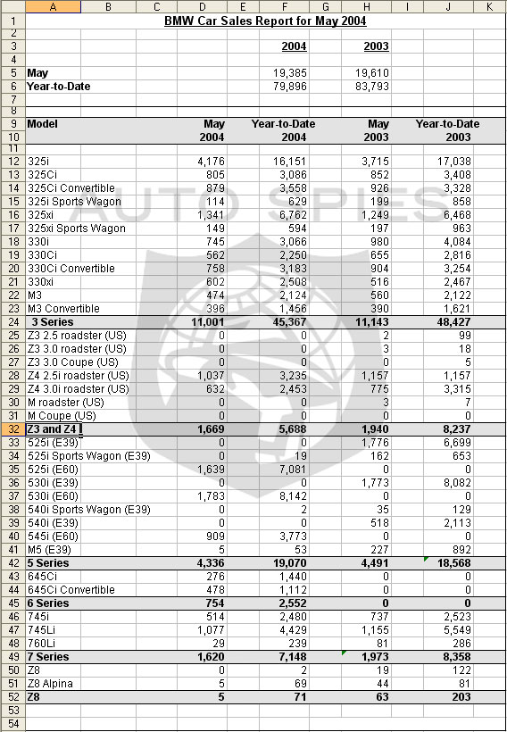 The BMW Group (BMW and MINI brands combined) reported an increase of 8 percent in May sales for 27,787 vehicles compared to the 25,765 vehicles sold that month in 2003, making it the best sales month ever for the BMW Group. The BMW Group also reported year-to-date sales of 115,737 vehicles, an increase of 3 percent from 112,278 sold in the first five months of 2003.