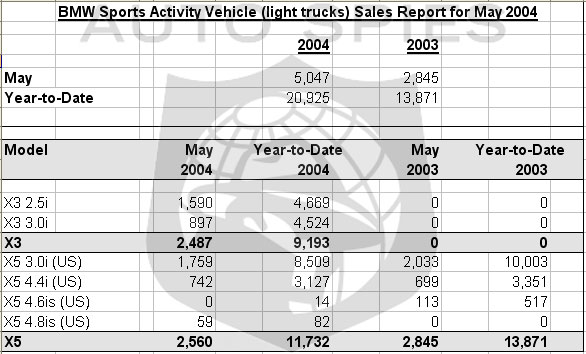 Strong sales of BMW's new X3 Sports Activity Vehicle have contributed to the record sales month. Total May SAV sales were 5,047, compared to 2,845 vehicles sold in May 2003, a jump of 77 percent. Year-to-date, sales of BMW's SAV models are up 51 percent, to 20,925 vehicles compared to 13,871 for the same period in 2003.