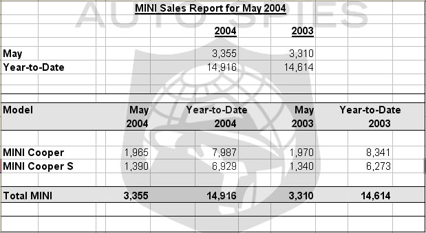 Demand for MINI brand automobiles continues to be strong. Sales of MINI automobiles in May are up 1.4 percent with sales of 3,355 over the 3,310 in 2003. Year-to-date, sales were up 2.1 percent, with 14,916 cars compared to 14,614 sold a year ago.