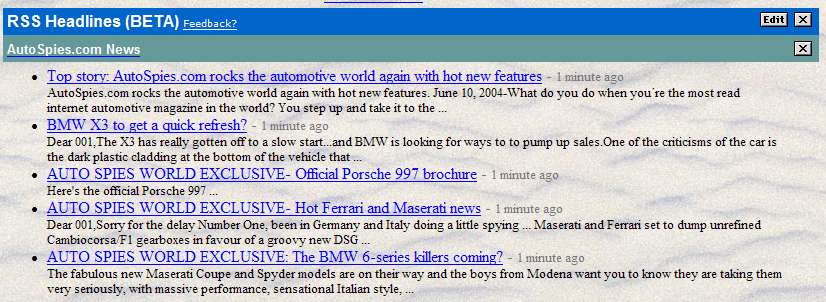 1. Autospies.com news now available at my.yahoo.com. Now anyone can display Autospies.com news headlines in their personal my yahoo accounts (see photo below)