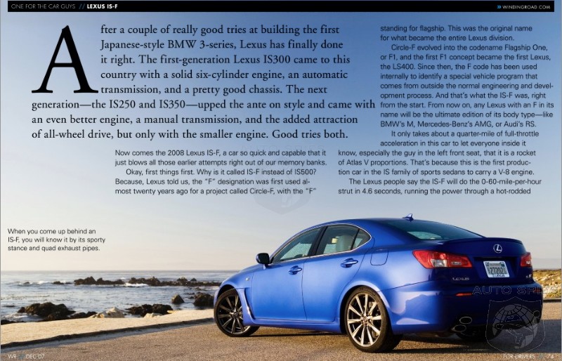 After a day and a half of pushing the IS-F's envelope on the hilly, twisty two-lane roads of Carmel and at Laguna Seca Raceway, we had tried everything the car has to offer--sport, normal, and even snow mode on a wet skid pad. With the Vehicle Dynamics Integrated Management system on, off and partly disabled (ABS and the electronic limited-slip differential are always on), both on the slalom course and on the whole, beautiful 2.2 miles of Laguna Seca, we discovered that the IS-F is far more talented as a car than we are as drivers. The steering precision we felt, the weight of the steering at the wheel, the quick turn-in and recovery were just about ideal for our tastes, and there's a reason for that.