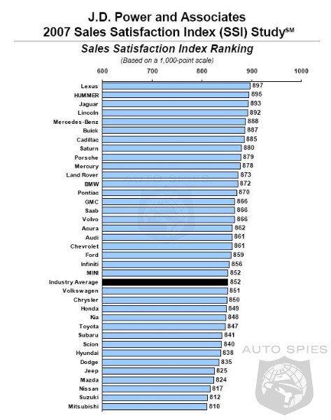 The 2007 Sales Satisfaction Index Study is based on responses from 38,654 new-vehicle buyers who registered their vehicles in May 2007. To view ratings on customer satisfaction with the new-vehicle sales process, visit JDPower.com.