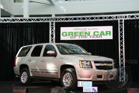 The Malibu and Aura seem like unlikely candidates for victory due to their mild hybrid systems and the Tribute is a re-badged Escape hybrid. The leaves the Altima and Tahoe as best bets. I'm guessing it will be the Tahoe because of the innovative Two-Mode hybrid system.