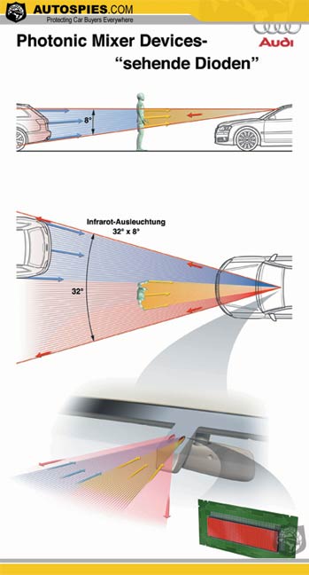 The sensor is placed behind the windscreen on a level with the rear-view mirror. At the heart of the technology is an infrared light source plus a detector module made from revolutionary new photosensitive semiconductor elements known as Photonic Mixer Devices (PMD). These diodes "with eyes" are able to process the return signals from a multitude of reflector points simultaneously.