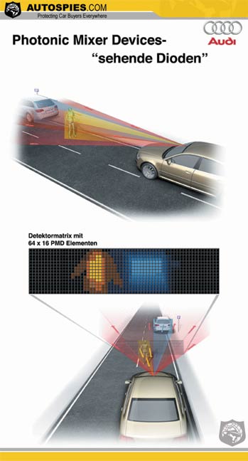 Venturing into the third dimension: at the 9th International Forum on "Advanced Microsystems for Automotive Applications" in Berlin, Audi Electronics Venture GmbH is presenting a pioneering innovation in the form of an anticipatory, optical proximity sensor system. This ultra-sensitive sensory system, which is being showcased in Berlin in a test vehicle, is capable of supplying a three-dimensional image of the scene in front of the vehicle. It offers a glimpse of things to come: although it is still several years away from being ready for series production, it opens up an exciting realm of possibilities in the field of both vehicle safety and driver assist and convenience functions, such as stop-and-go assist and parking aid systems.