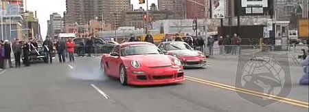 Watch as Bryce Miller and the Farnbacher-Loles 911 GT3 Cup Car tear it up against Roger Garbow and the Farnbacher-Loles Porsche Cayman GTR during the opening ceremonies for the 2008 New York International Auto Show.