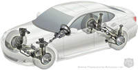 New mono-tube shock absorbers with rebound springs are used front and rear. These make use of much larger pistons than conventional twin-tube shocks of the same size and their larger size offers superior damping force response and control, especially at low piston speeds. Multi-leaf linear control valves also help in this regard. The rebound springs offer improved body control without typical ride comfort tradeoffs.