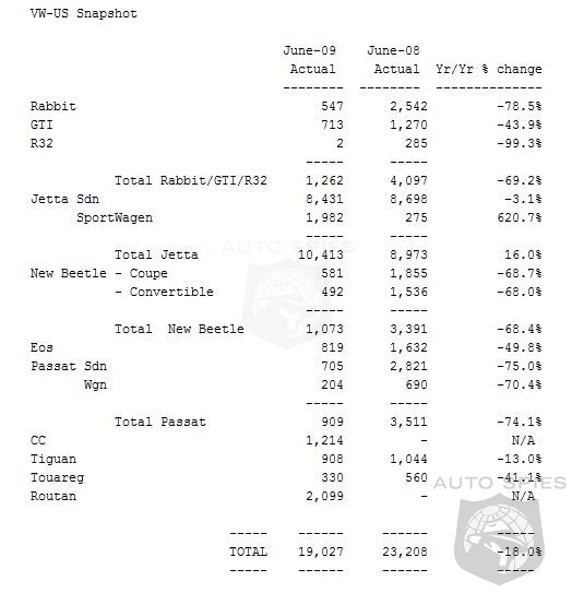 Volkswagen of America, Inc. today announced June 2009 sales of 19,027 units, representing an 18 percent decrease over June 2008. However, Volkswagen's award winning clean diesels posted their best sales month since their re-launch with 5,072 units, representing an impressive 26 percent of total sales.